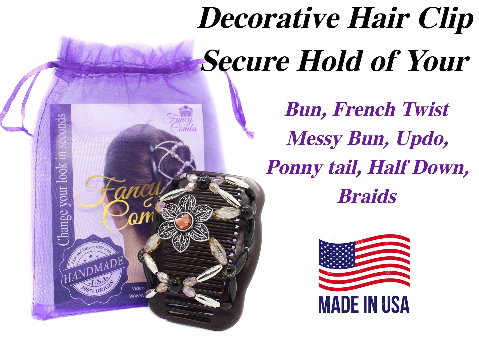 Fancy Combs is one of the most exciting hair accessories on the market. Affordable and easy to use and style with these combs. The double-locking of the combs can secure your hair throughout the day. Capable of holding any type of the hair, from thin to thick, from short or long. The product is handmade with rubber double combs, durable elastic, silver and gold plated beads along with sparkling crystals. The beads catch the light nicely at the turn of your head. The combination of the metals and beads will create a gorgeous look for your hair. These combs are elegant for weddings while versatile enough for a workday. These are perfect for those "Bad Hair Days!" Whether that means the office or the grocery store. These combs are wonderful for even a run or trip to the gym. Elastics can (and do) break the hair, or cause headaches. My Fancy Combs are soft and durable enough to sleep on or to set your head in a car, while gentle on hair.